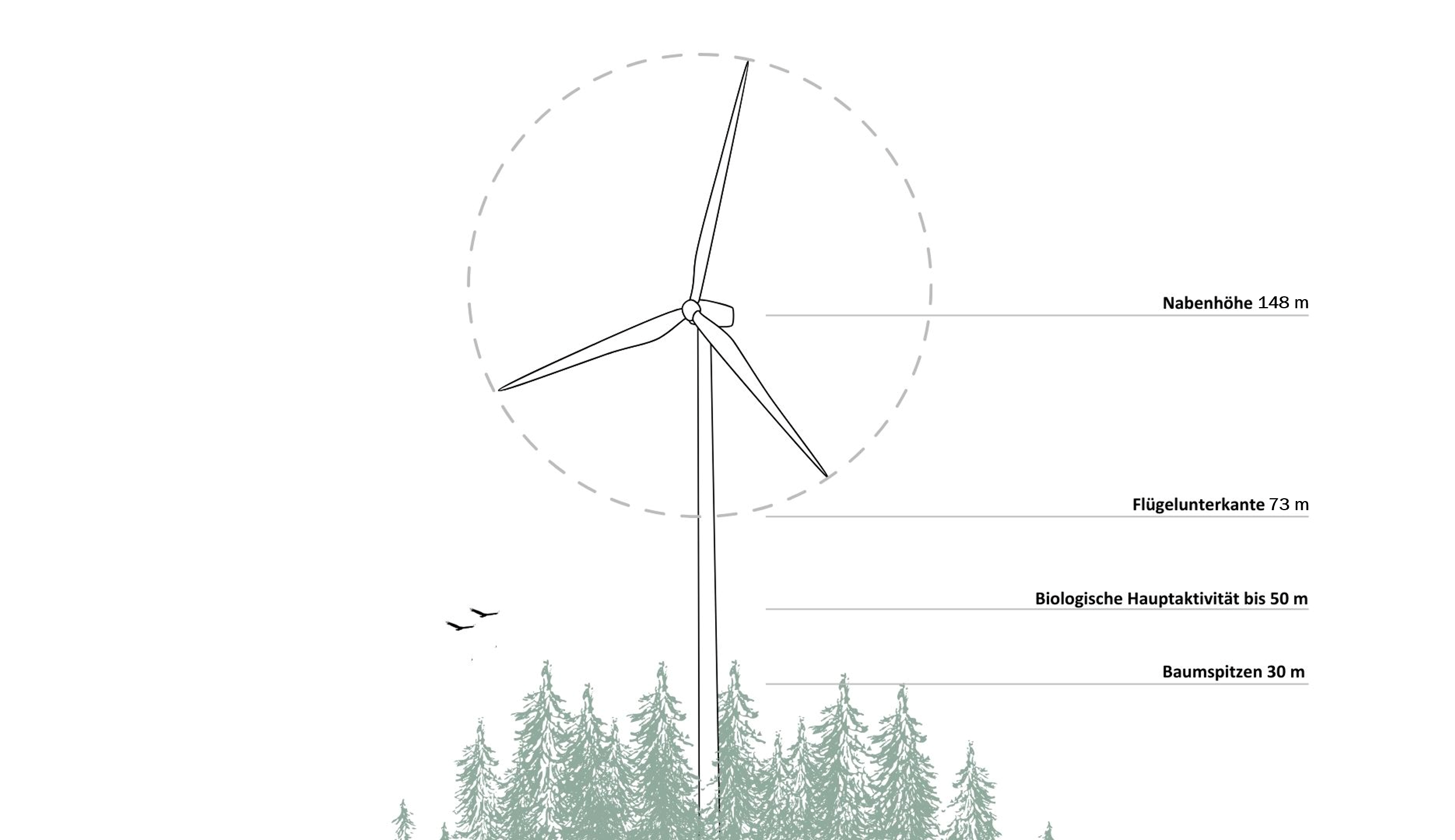 - Die Windrad-Flügel Unterkante befindet sich auf mindestens 73 Meter über dem Boden, dh. es sind mindestens 23 Meter zwischen biologischem Hauptaktivitätsraum und Windradflügel.